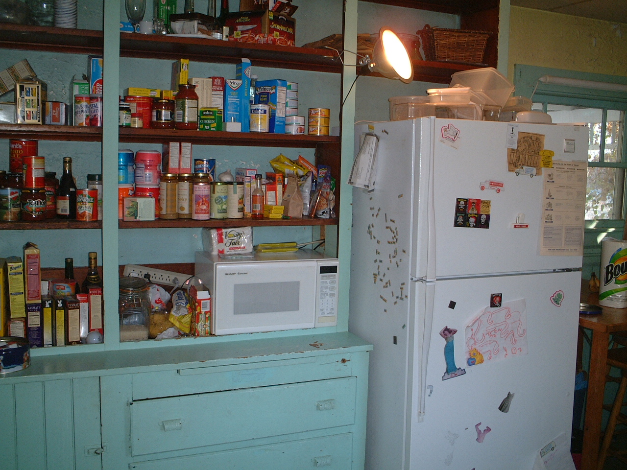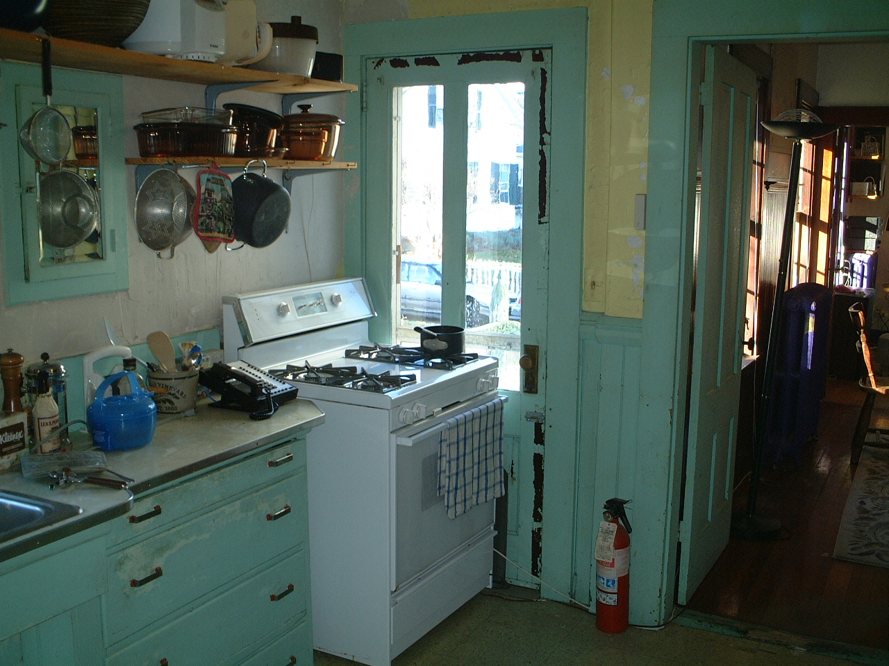KitchenThis is our kitchen. It's definately the worst room in the house. It's got a dropped ceiling that looks like it was installed sometime in the late 1940s or early 1950s. Above the dropped ceiling is a plaster ceiling that looks like the ocean during a storm, only upside down. On the other hand, we have replaced the appliances, put in a nice stove, and even installed a dish washer. These are all very good things. Oh, we were wrong about the lead paint: the kitchen is filled with it.