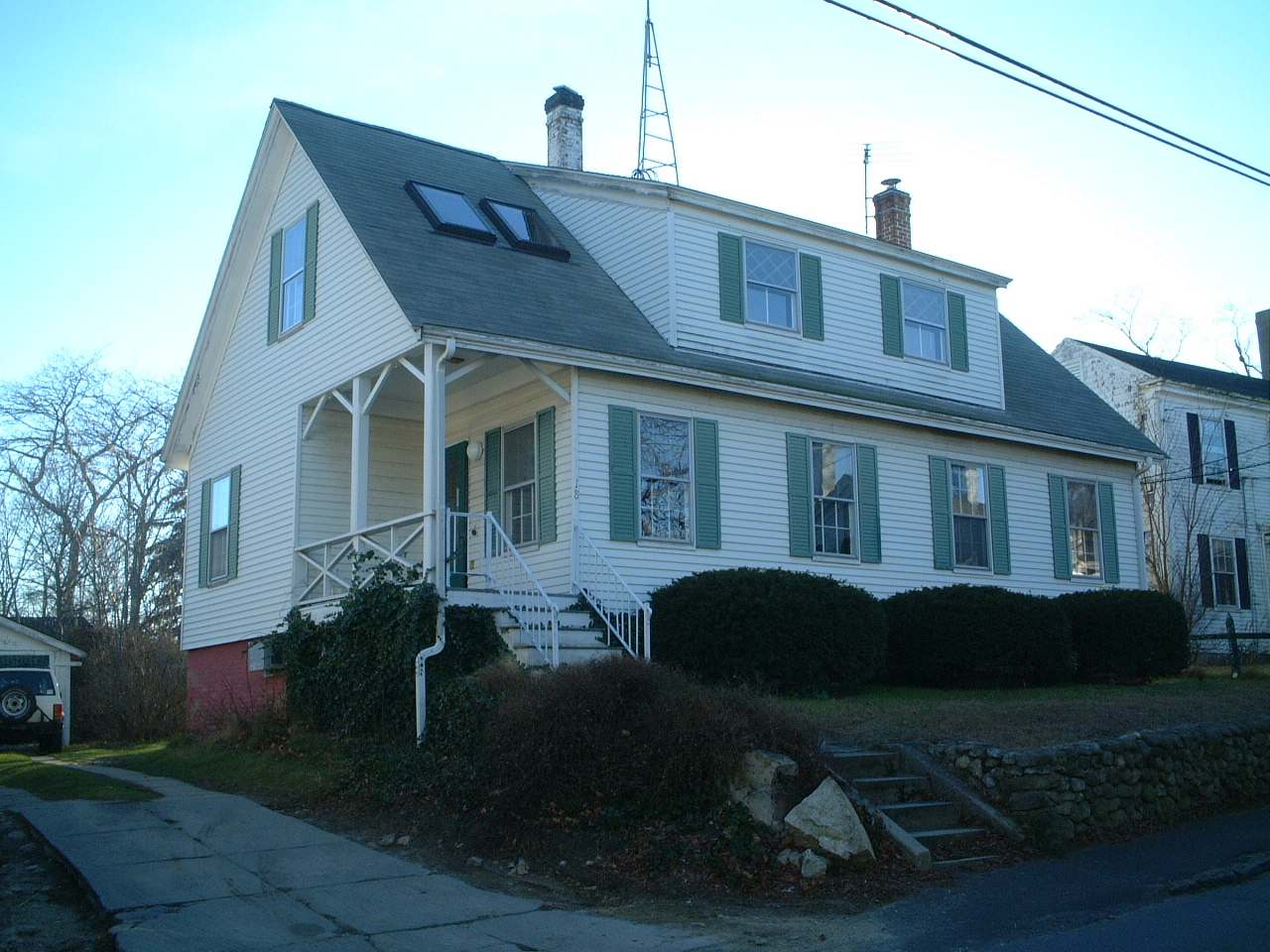 If you look carefully at the roof, you will notice something wrong: there are three layers of shingles. This is quite illegal. When we bought the house, the first thing that we did was put a new roof on it. We are also having a skylight cut into the room on the left side of the house, which is the side that has a water view.